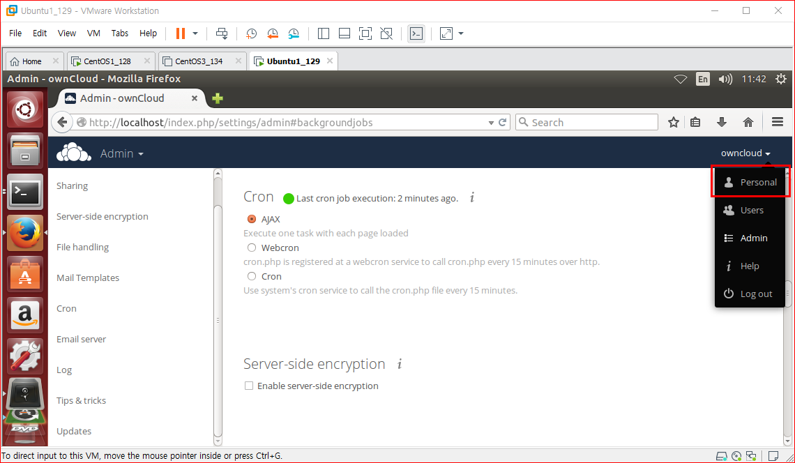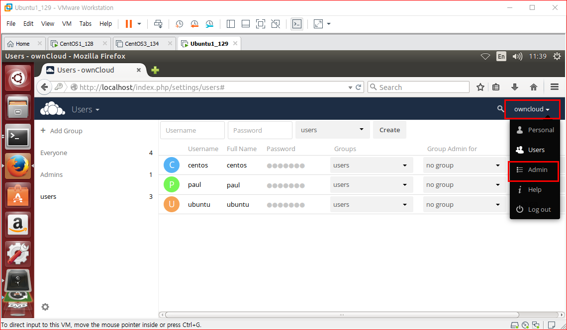 우측 owncloud drop down 해서 Admin 으로 변경한다