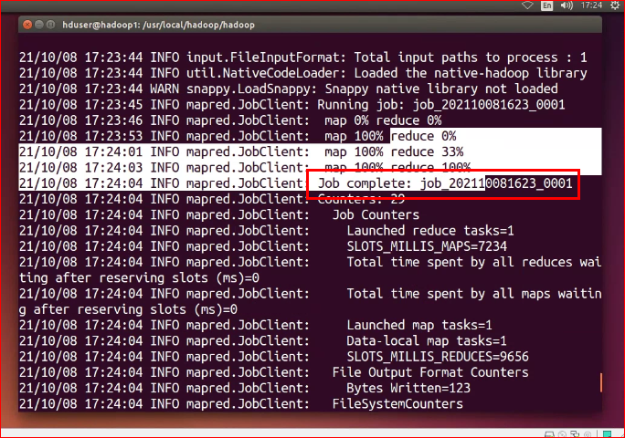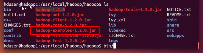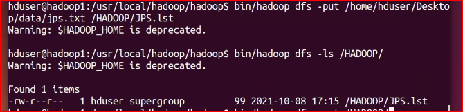$ bin/hadoop jar /usr/local/hadoop/hadoop/hadoop*examples*.jar wordcount /HADOOP/JPS.lst /home/hduser/Desktop/data/output.txt