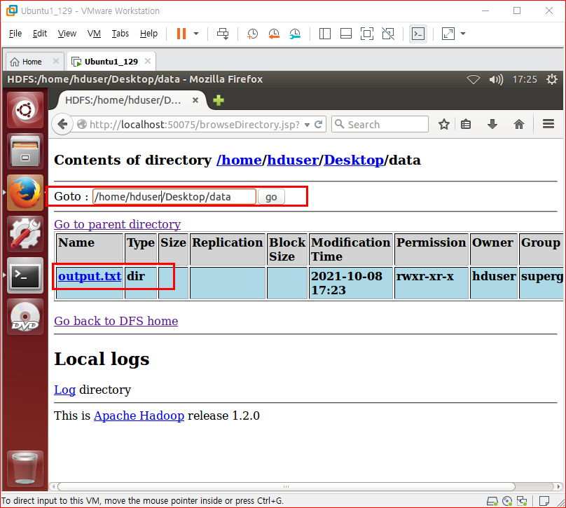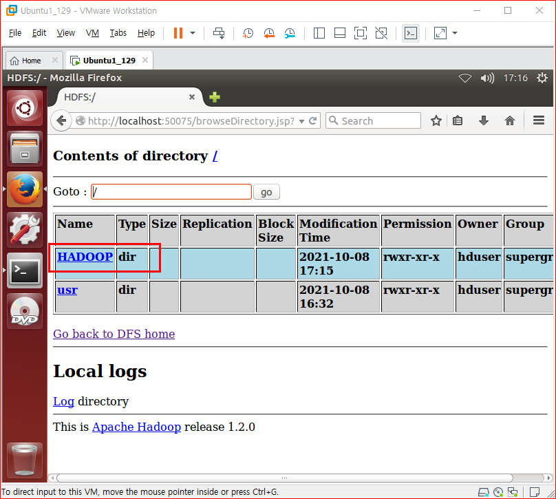 Lancher의 firefox를 실행해서 주소창에 http://localhost:50070 을 입력한다