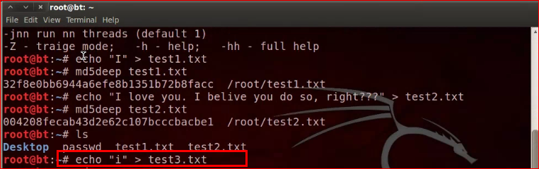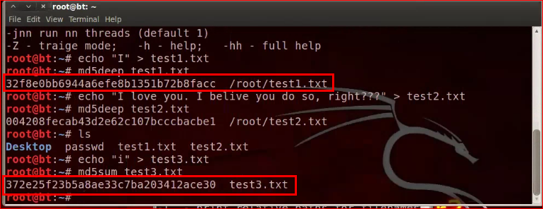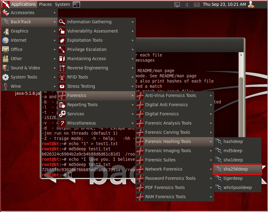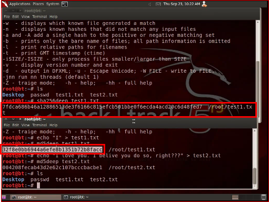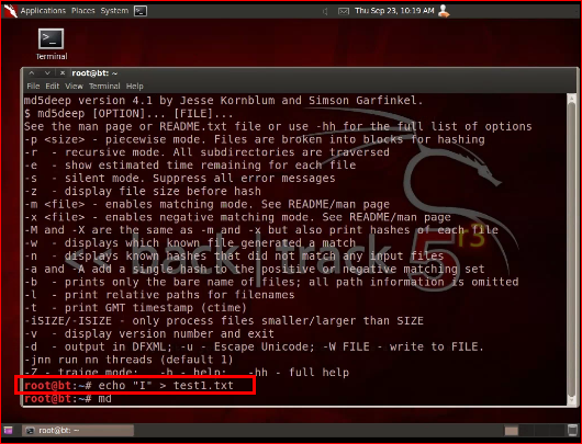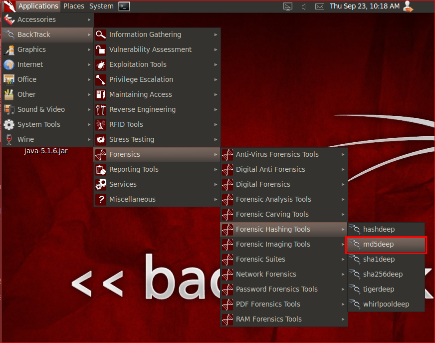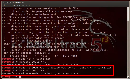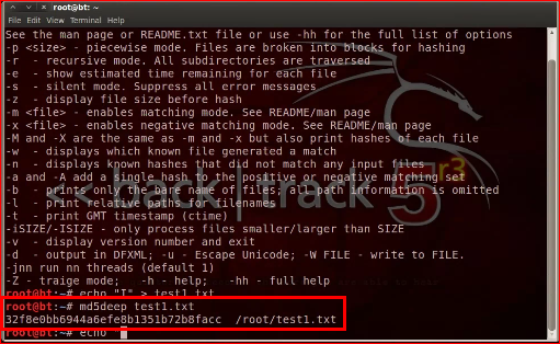 Appllications > BackTrack > Forensics > Forensic Hashing Tools > md5deep