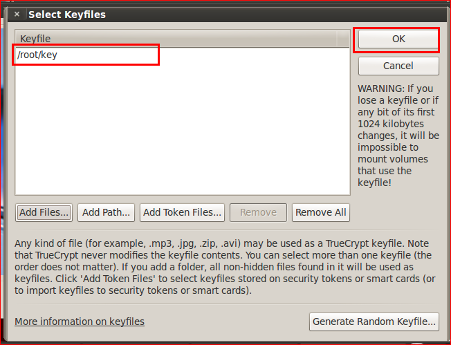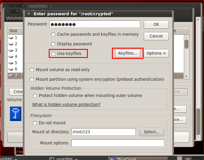 Use Keyfiles 옆에 있는 Keyfiles 아까 만든 /root/key 파일 선택후 Open