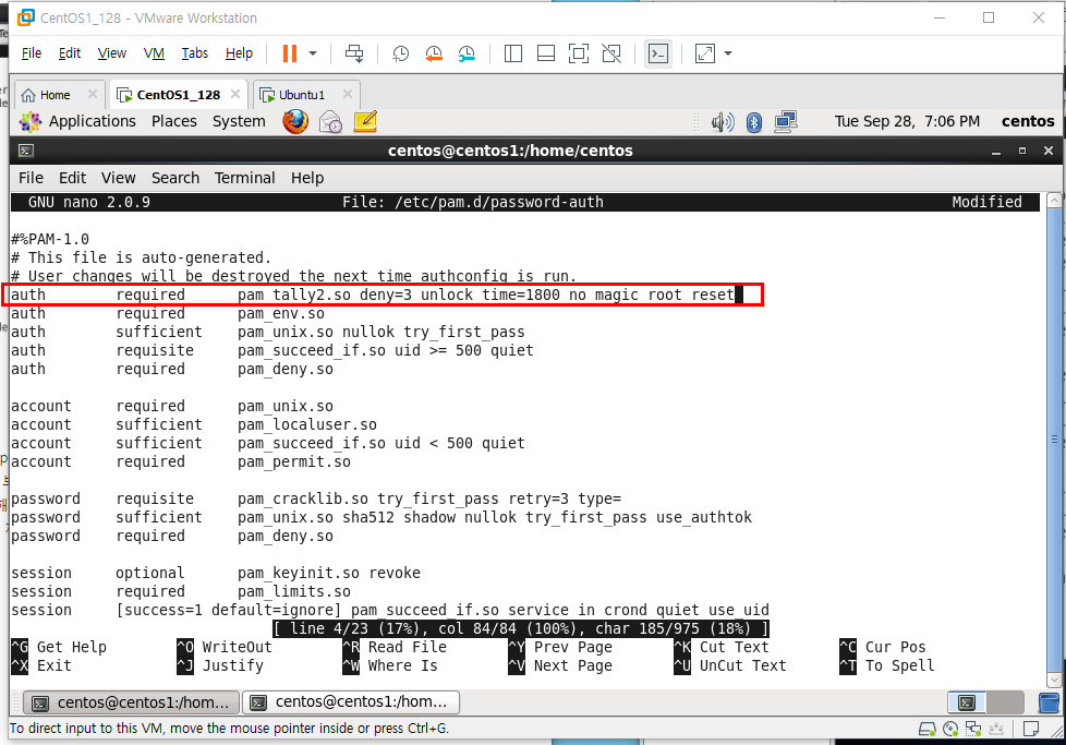 auth required pam_tally2.so deny=3 unlock_time=1800 no_magic_root reset 추가한다
