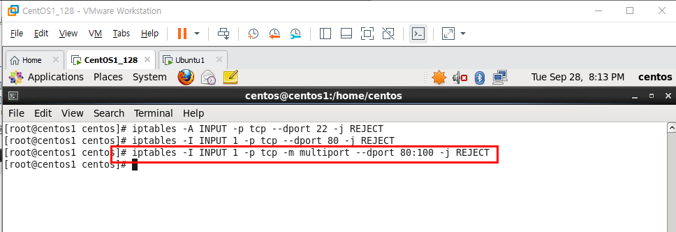 # iptables -I INPUT 1 -p tcp -m multiport --dport 80:100 -j REJECT