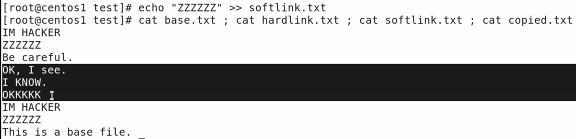hard link는 원본에서 만들어졌기 때문에 원본이 변경되면 더이상 변경되지 않습니다ㅣ. soft link는 변경된 원본을 계속 추적해서 단축키처럼 반영합니다. 그렇게 때문에 소프트 링크는 보안상 문제가 있으므로 주의해서 관리해야한다.