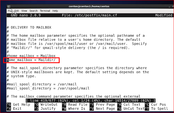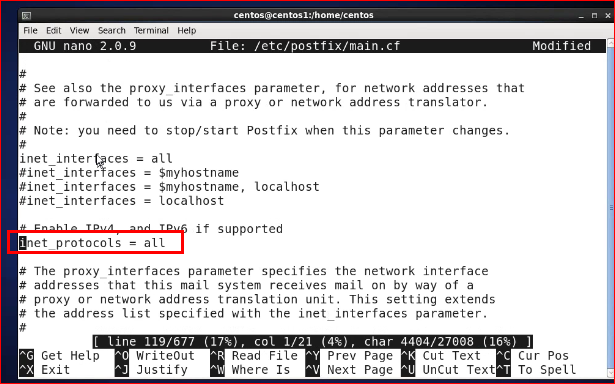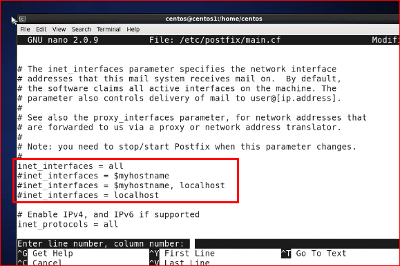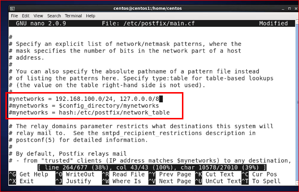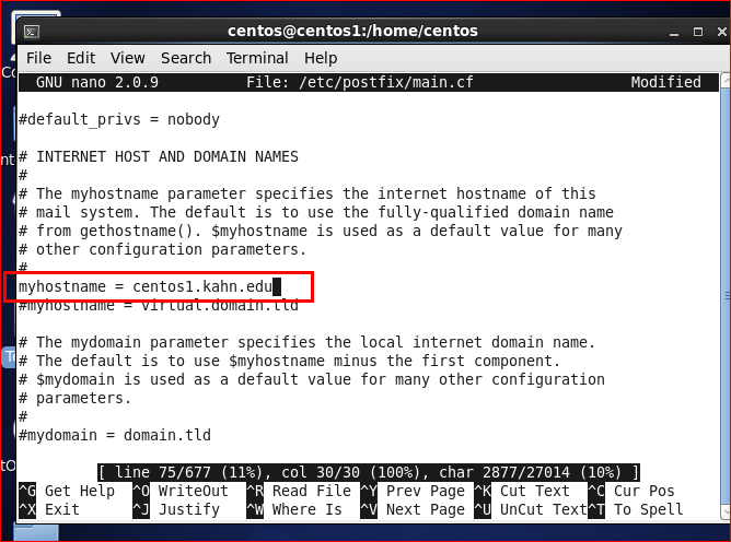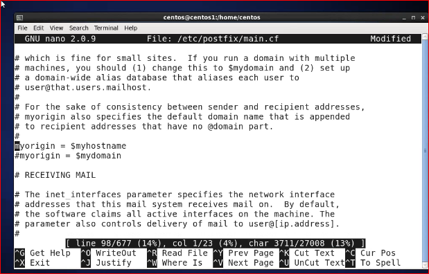 [root@centos1 centos]# nano -c /etc/postfix/main.cf